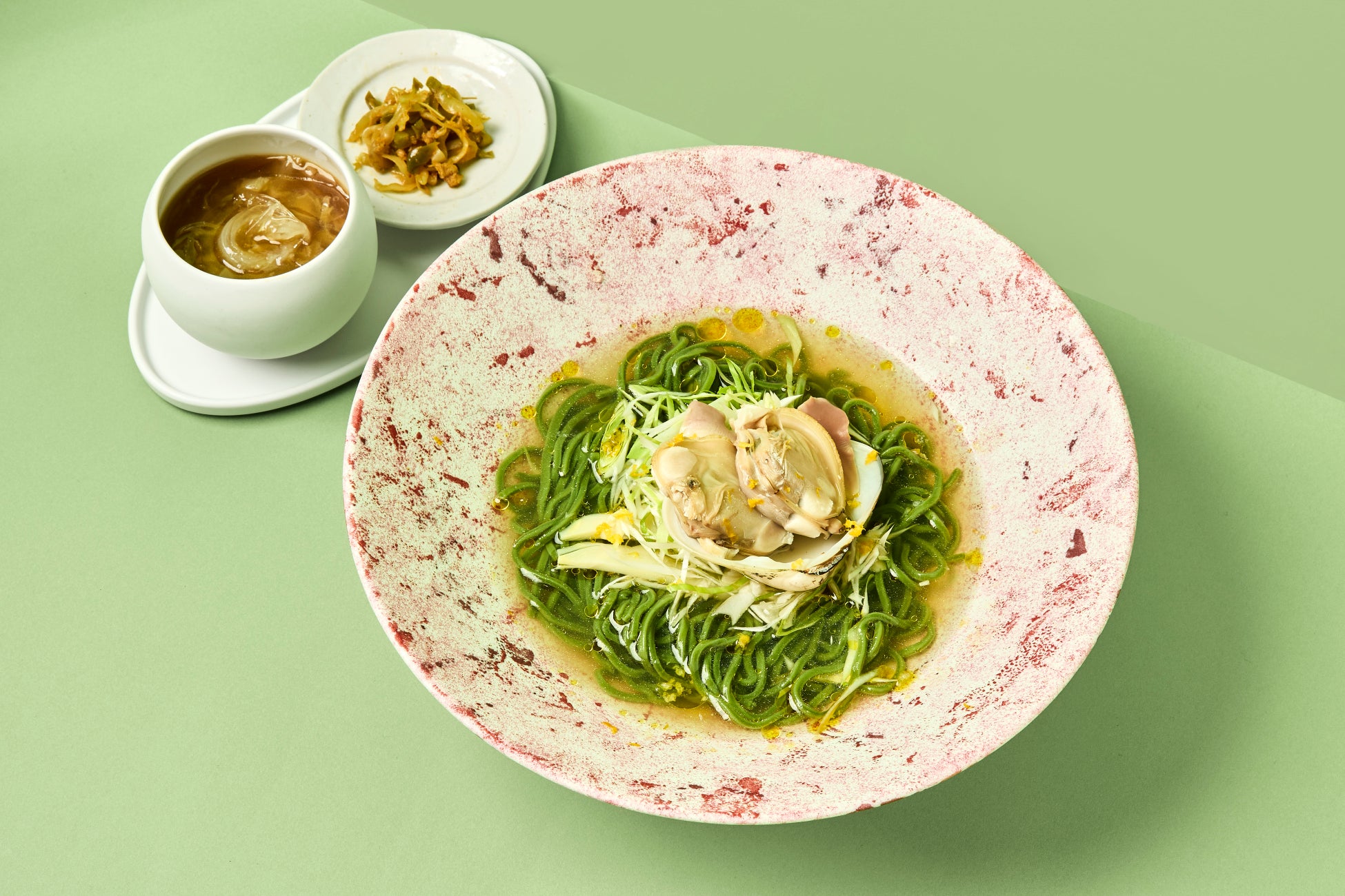 淡路島産わかめを練り込んだ冷たい翡翠麺は、わかめ由来のとろみと独特のなめらかさが特徴。はまぐりベースの塩味スープに山椒とゆずが香り、具材には、はまぐりやうるいなど春食材を使用。まずはそのままの風味を楽しみ、途中でふかひれスープを加えて味の変化も堪能できます。