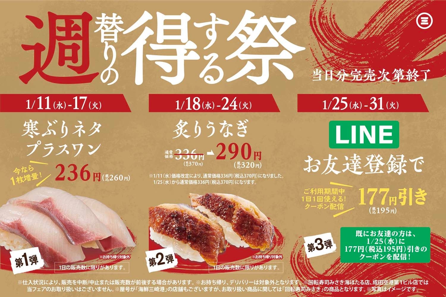 - 【回転寿司みさきの特ダネ情報】週替りの得する祭を開催!