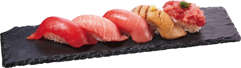 また、赤身を店内調理で漬けにするひと手間を加えた「生本鮪赤身の漬け」、炙るひと手間を加えた中とろが味わえる、「生本鮪炙り中とろ」、“生”と“炙り”の中とろが楽しめる「生本鮪中とろ食べ比べ」もご用意いたしました。その他にも、一皿で赤身、中とろ、大とろが楽しめる「生本鮪三貫盛」、さらに、“炙り中とろ”に“剥き身”を加えて、部位と仕立てを変えた五貫が食べ比べできる「生本鮪五貫盛」も登場します。