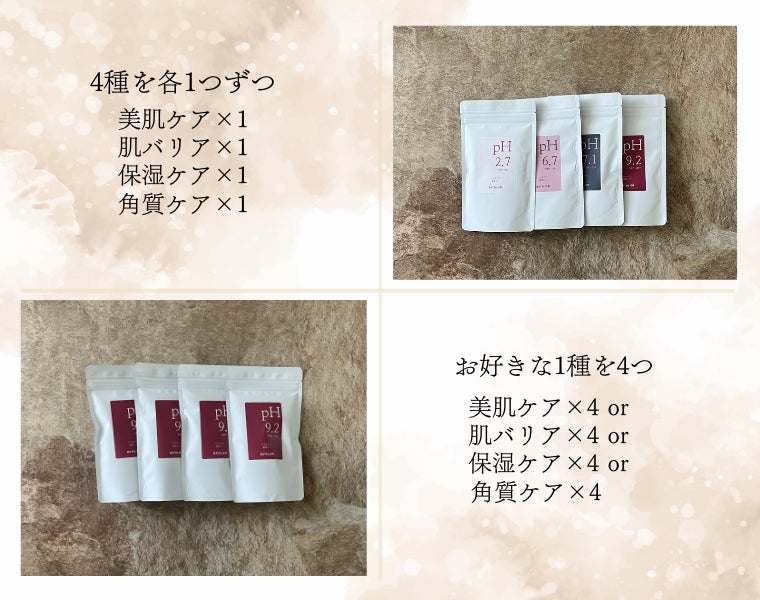 ・つかるだけ美肌ケア×1、肌バリア×1、保湿ケア1、角質ケア1の4種各1つずつ