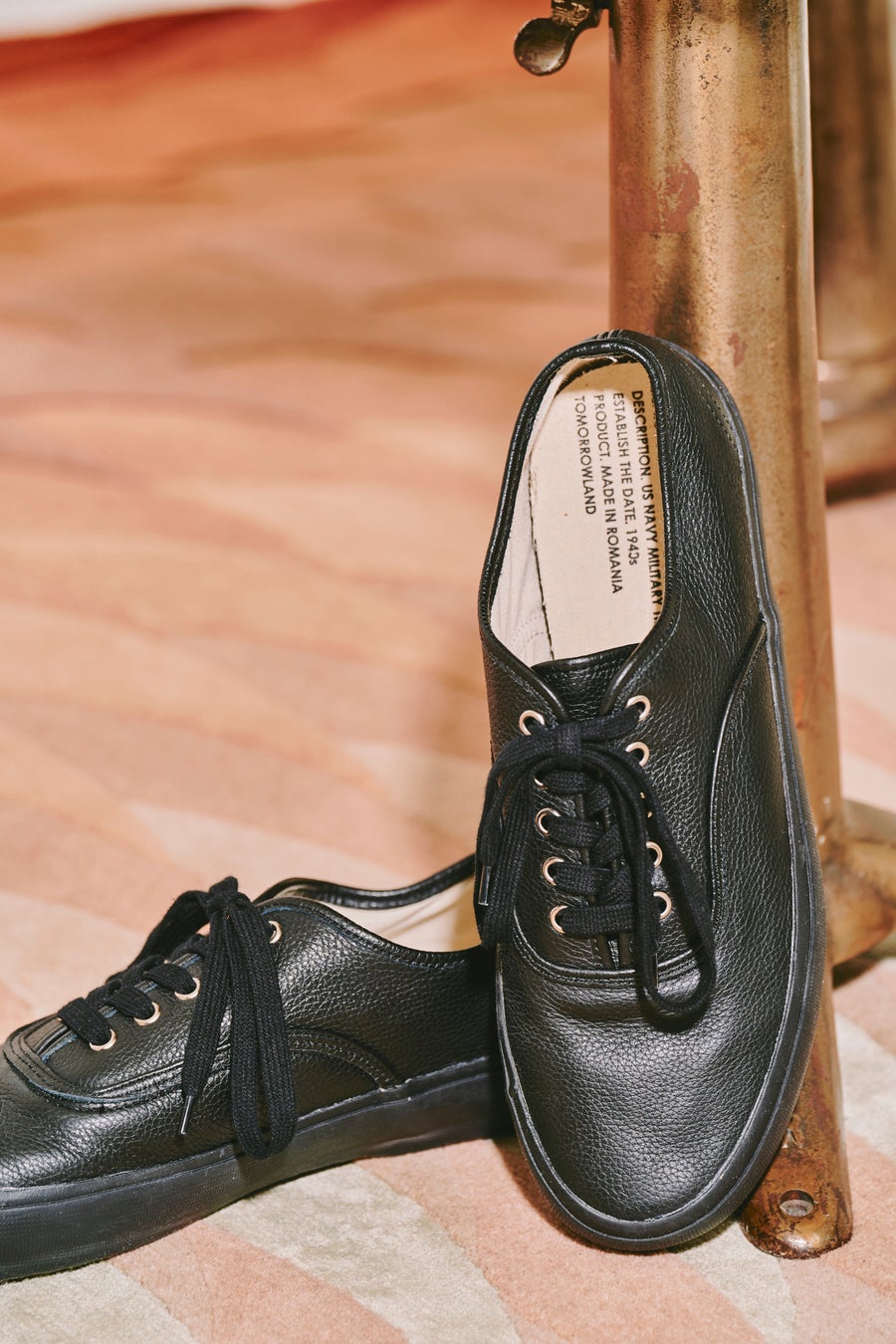 US NAVY MILITARY TRAINERをベースにイタリアンシュリンクレザーを採用し、ソールをアッパーと同色、アイレットをシルバーに別注。