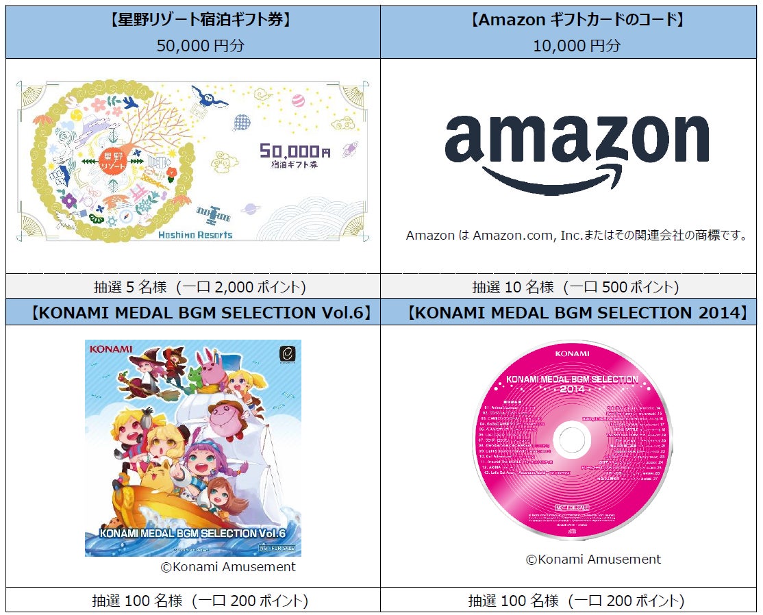 「ハッピーサマーキャンペーン」のプレゼントラインナップには、「星野リゾート宿泊ギフト券 50,000円分」や「Amazonギフト券のコード 10,000円分」のほか、KONAMIのメダルゲームのサウンドトラックCDなどがあります。