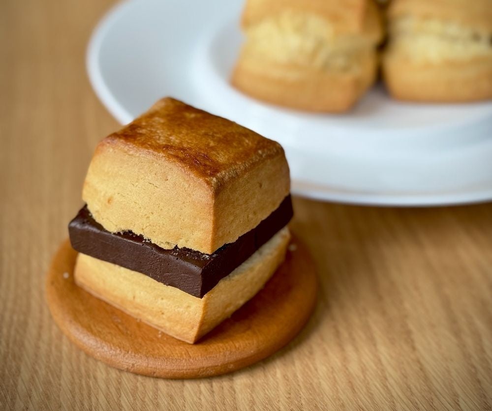 北海道産のバター、小麦粉、生クリームをふんだんに使用した生チョコサンドスコーンは、しっとりとした食感と小麦香る素朴な味わいと、濃厚な特製生チョコレートの相性が絶品です。