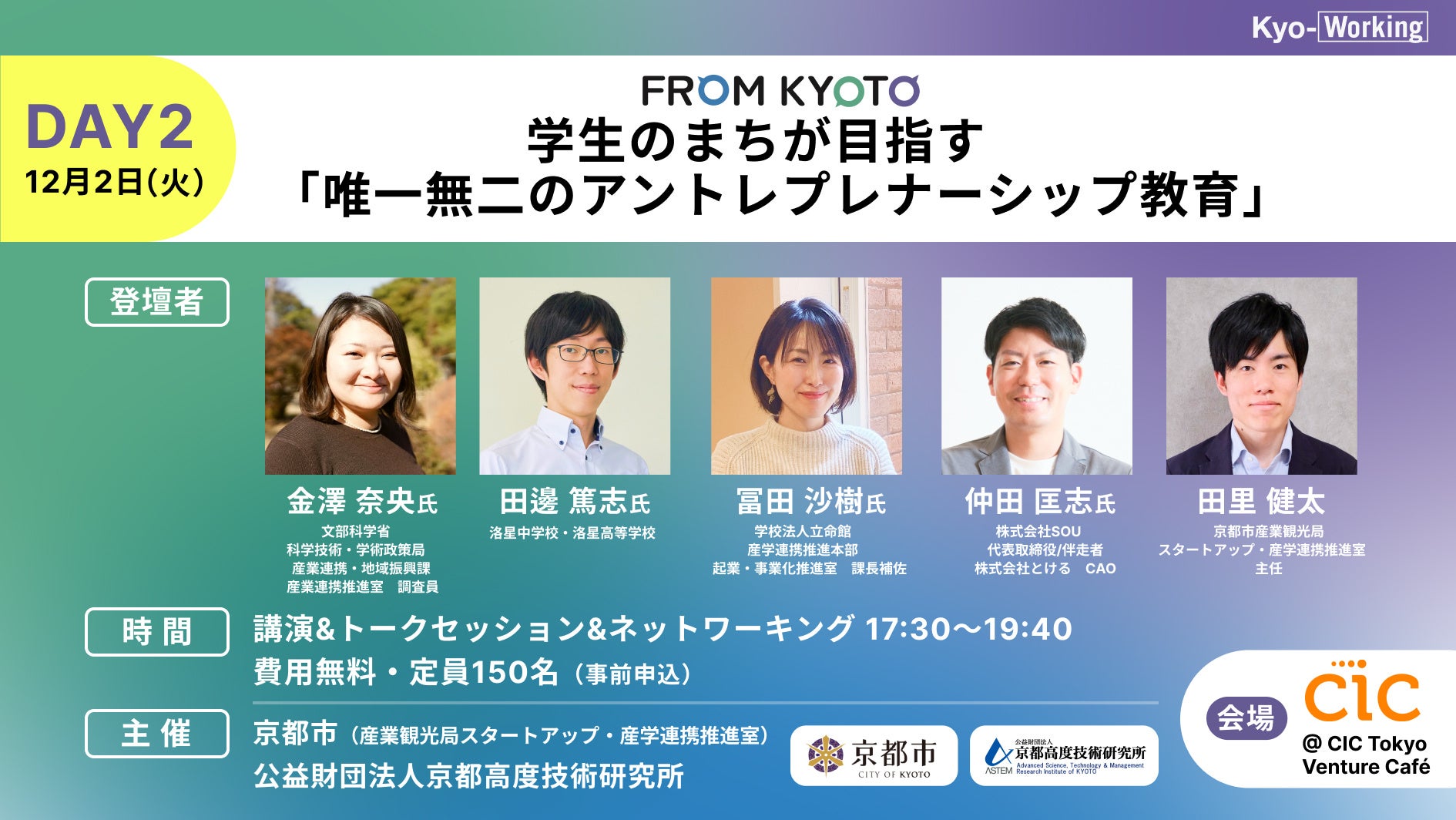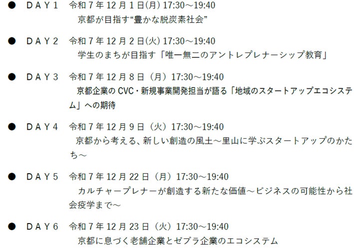 本イベントでは、京都から発信したい先駆的なテーマを多様な登壇者が議論することで、前例にとらわれない、世界にインパクトを与えるスタートアップの創出の「きっかけ」を提供し、京都のみならず、我が国のスタートアップ・エコシステムの充実につなげます。