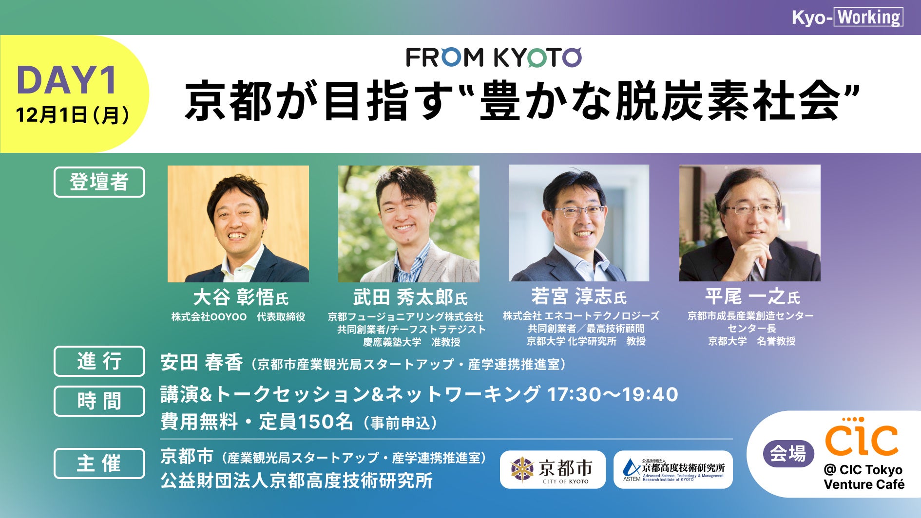 近年ますます注目が高まっている「脱炭素」「カーボンニュートラル」「気候テック」…これらの分野での起業や事業化につながるシーズが京都には数多く存在している。京都においては、京都大学や「京都市成長産業創造センター(ACT 京都)」等に、グリーンイノベーションの創出を目指す企業や研究者が集まっていることに加え、産学公の連携により環境及びエネルギー問題の解決に資する技術の確立を目指す「京都グリーンケミカル・ネットワーク」など官民の活動も活発に行われている。本イベントでは、「学生のまち」「知の集積地」である京都の強みを発信し、京都の企業、研究者と首都圏の企業、投資家とのリレーションを強化するとともに、「豊かな脱炭素社会」について深く議論する。