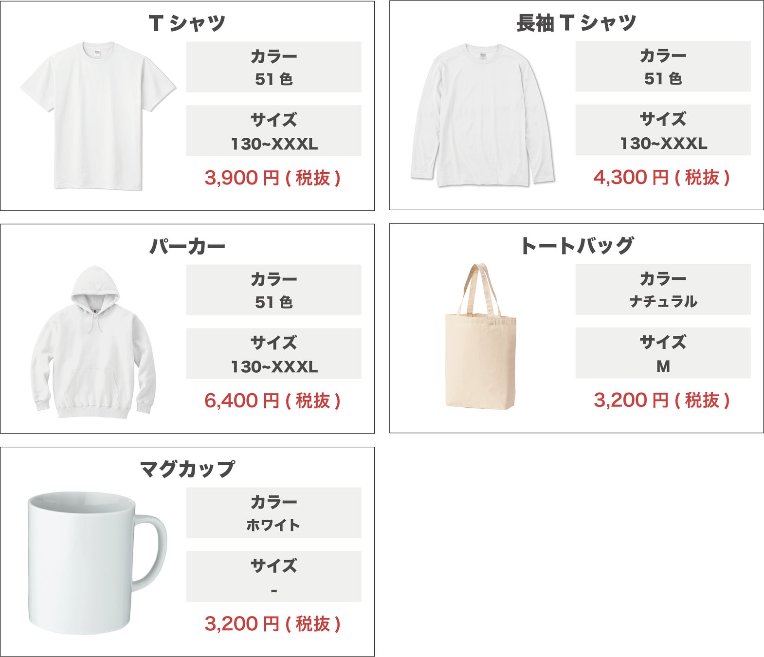 価格 :Tシャツ1枚1,100円(税込み)から ※プリント代込み、100枚以上まとめて割適用