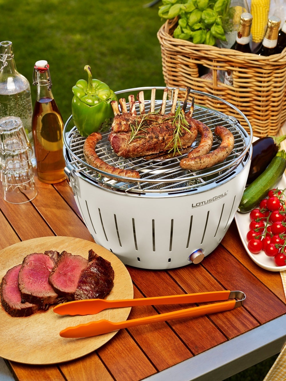 ロータスグリルは、「煙」と「着火」という、これまでの炭火BBQにはつきものだった2点を解消した炭火コンロです。内部に電池で駆動するファンがあり、空気を炭に直接吹きつけることで、すばやく炭に火がつき、より効果的に燃えます。送風量コントロールスイッチを回すことで火力の調節が可能です。容器は火が燃えていても外側が熱くならない二重構造。また、インナーボールと網は、食器洗浄機にも対応していますので、お手入れも簡単です。期間限定で、特別価格でご提供いたします。
