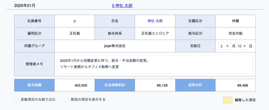 過去の給与データを確認する際に、部署内への伝達事項として、従業員ごとにメモを残すことができます。