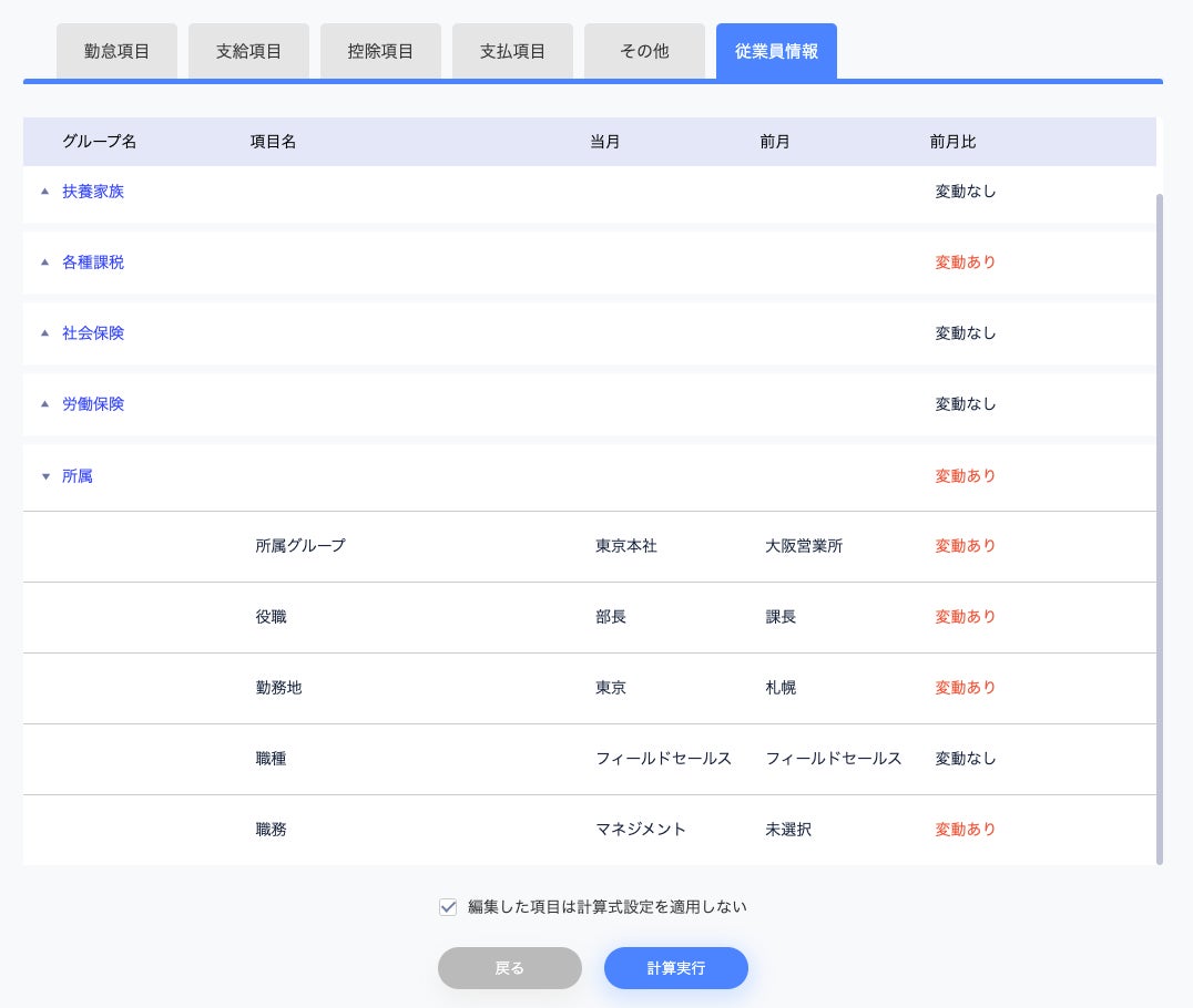 扶養家族/所得税/社会保険料等、給与計算時の設定に必要な情報や、所属/役職等の従業員情報に関して、前月との差分を画面上から確認することができます。