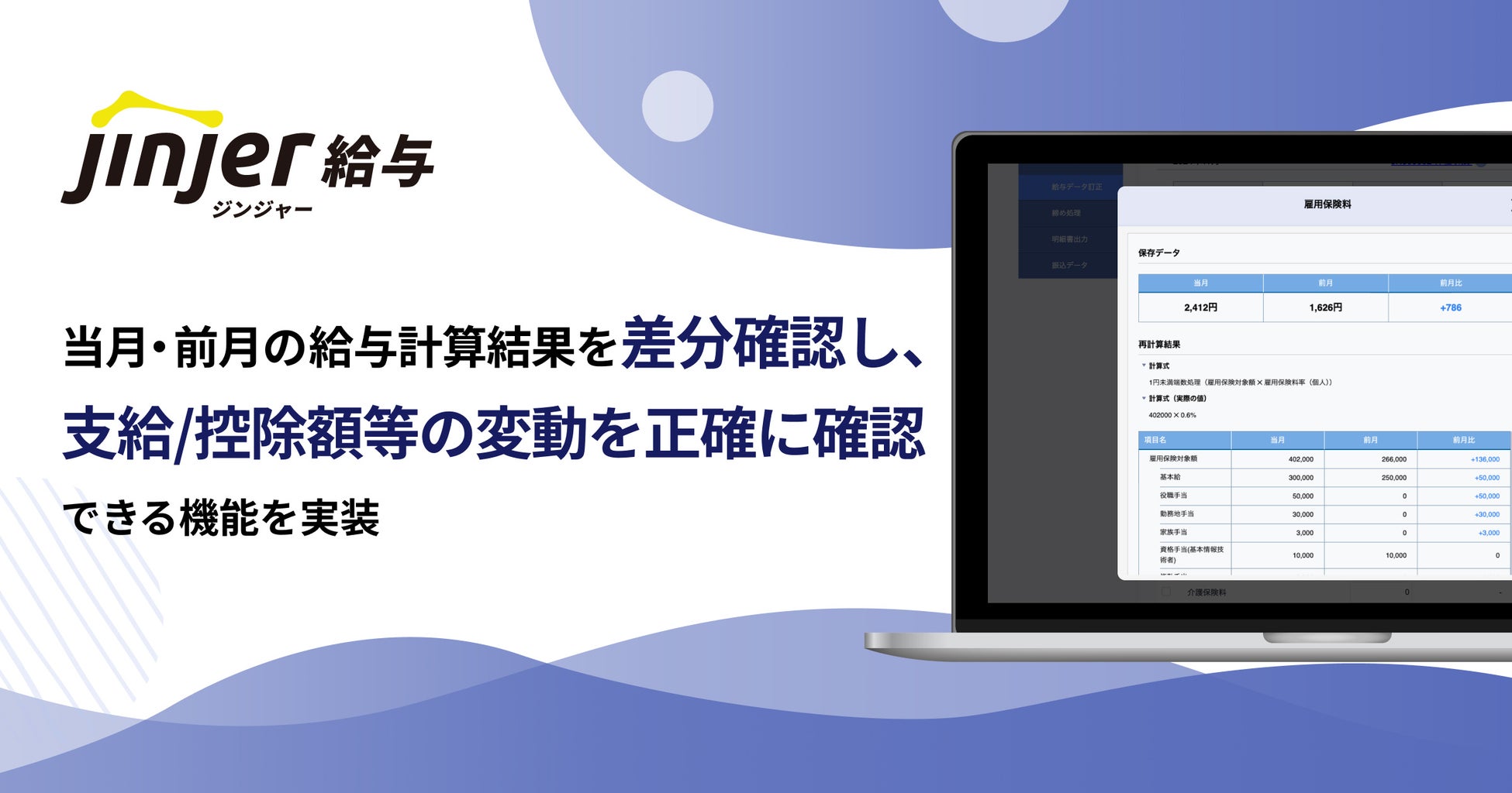 クラウド型人事労務システム「ジンジャー」を提供しているjinjer株式会社(本社:東京都新宿区、代表取締役社長:桑内 孝志)は、「ジンジャー給与」で、当月の給与計算結果を、前月分の結果と差分確認し、支給/控除額等の変動を正確に確認できる機能を実装したことをお知らせします。