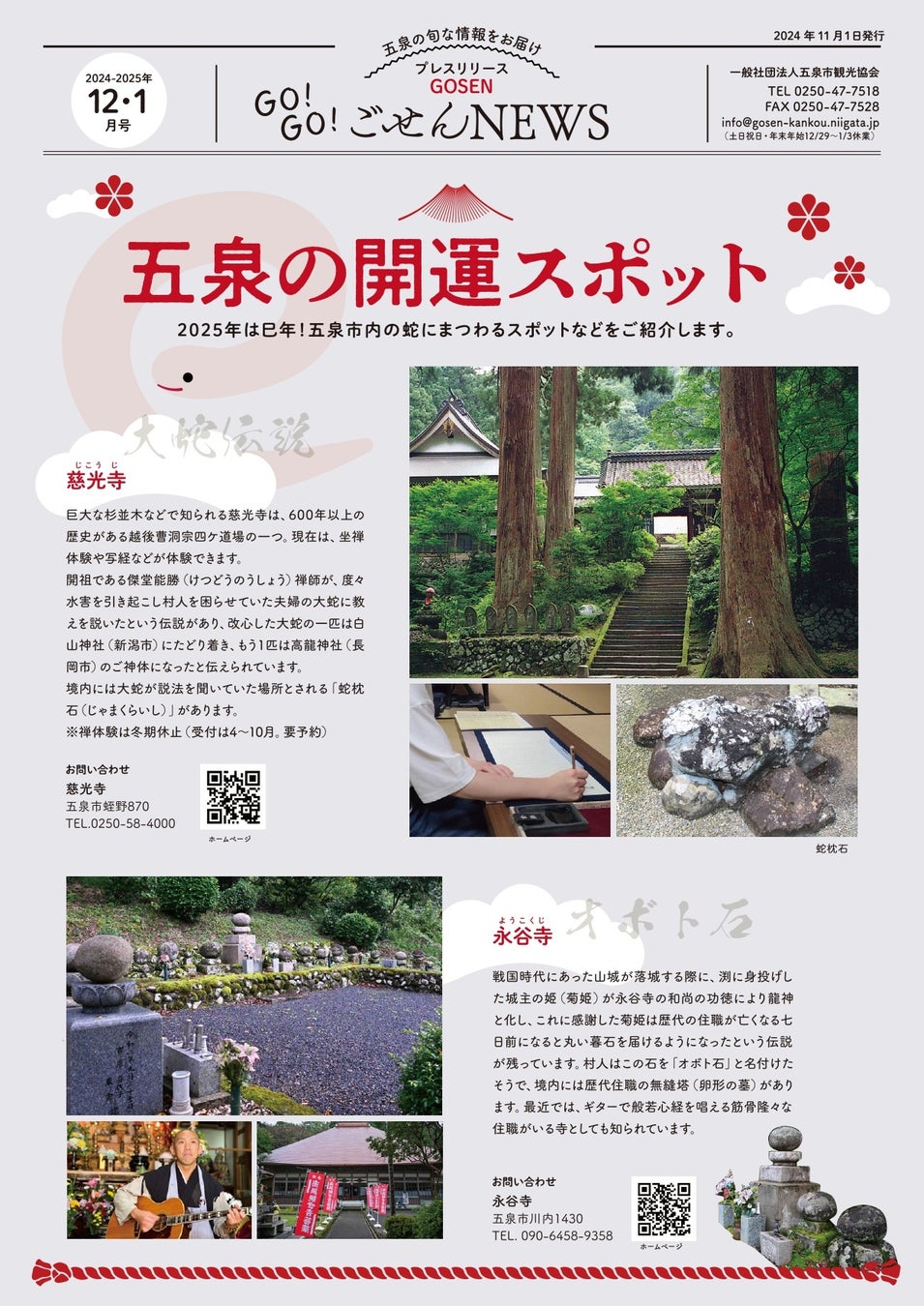新潟県五泉市の旬な情報をお届けする、プレスリリース「GO!GO!ごせんNEWS」最新号を発行いたしました。2025年は巳年!五泉市内の巳にまつわる開運スポットや、冬のグルメ情報など、盛りだくさんの内容です。