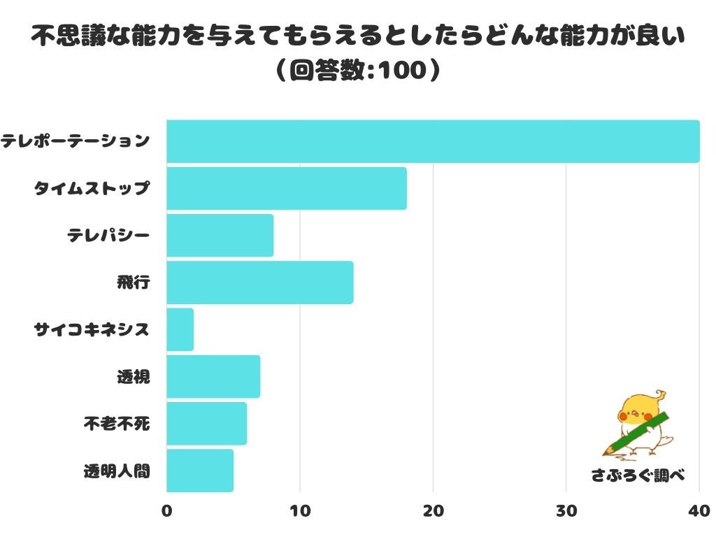 2位以降は、「タイムストップ」、「飛行」と続き、「サイコキネシス」は8位という結果になりました。
