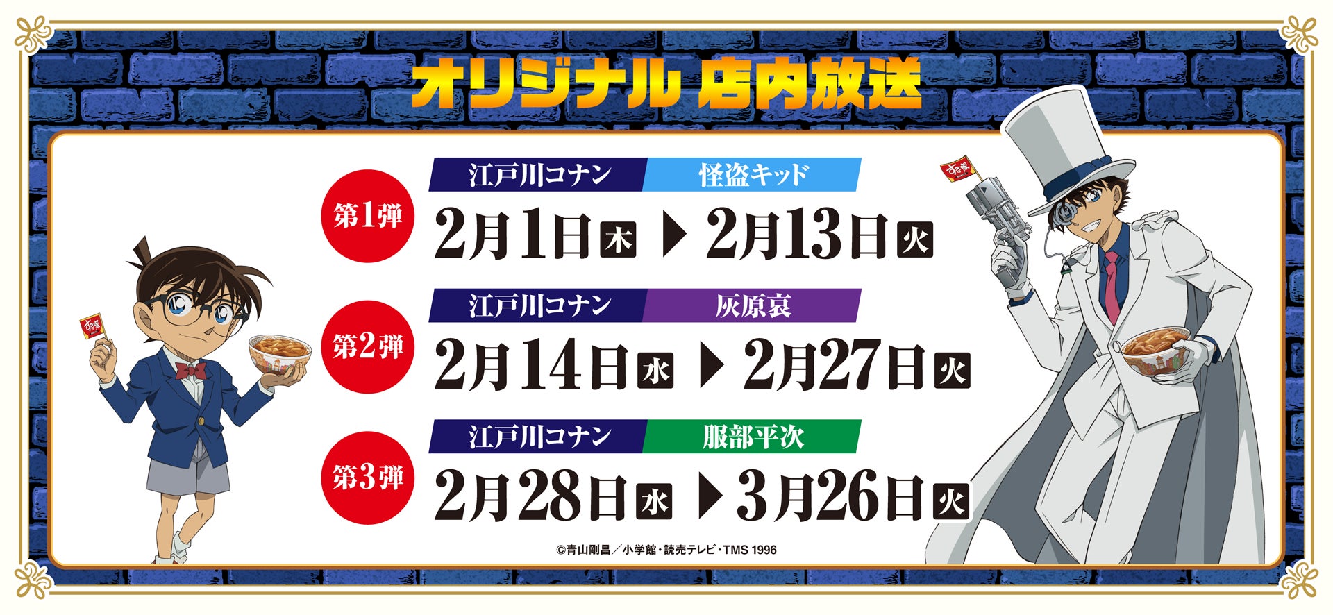キャンペーン期間中、キャラクターたちによる店内放送を聞くことができます。放送内容は第1弾~第3弾に分かれ、江戸川(えどがわ)コナンと、怪盗(かいとう)キッド、灰原哀(はいばら あい)、服部平次(はっとり へいじ)との掛け合いが楽しめます。