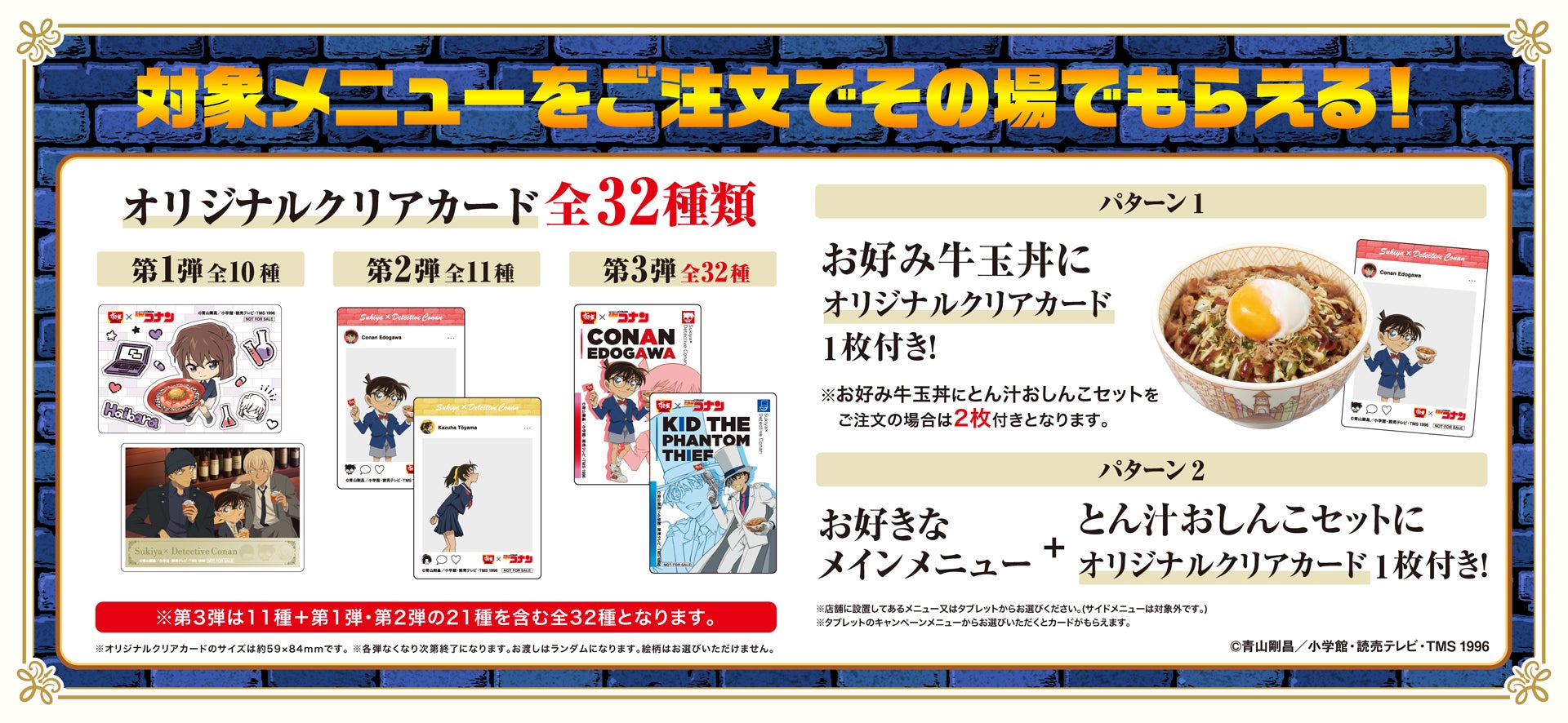 【すき家】2月1日より「すき家」と「名探偵(めいたんてい)コナン」のコラボキャンペーンを開催!対象メニューを注文するとオリジナルクリアカードが必ずもらえるなど、企画が盛り沢山!