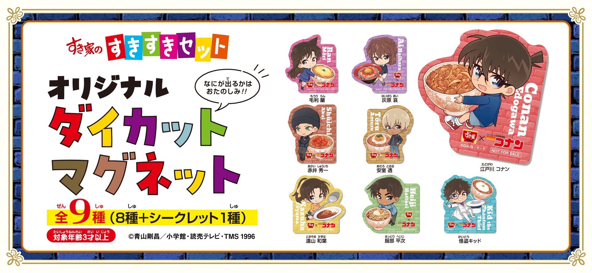 お好きなメインメニューに+220円(税込)で「オリジナルダイカットマグネット」と「カットりんご」、「選べるドリンク」が一緒についてくる、すきすきセット「名探偵コナンオリジナルダイカットマグネット」を販売します。「オリジナルダイカットマグネット」は、8種類+シークレット1種類の全9種類ご用意しています。