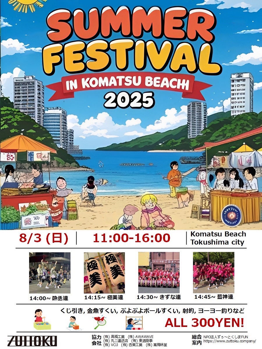 徳島市の人気スポット・小松海岸を舞台に、「Summer Festival in Komatsu Beach 2025」が2025年8月3日(日)に開催されます。本イベントは、阿波踊りの有名連によるパフォーマンスや、懐かしの縁日遊びなど、親子三世代で楽しめるコンテンツが充実。全ての体験が300円という良心価格で提供され、地域密着型の夏イベントとして高い注目を集めています。