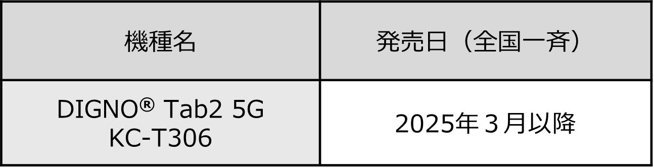 ※10 発売されたタイミングから起算して最大2回、最新OSへのバージョンアップが適用されます。適用回数は、購入時期によって変わります。 また、最新OSとは「DIGNO® Tab2 5G KC-T306」に搭載されているAndroidTM OSに対して、OSバージョンアップが可能な時期に おいて適用されるAndroid OSの最新版をさします。適用回数は販売開始時点の予定であり、変更となる可能性があります。