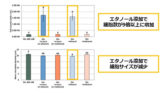 高濃度グルコースに加えてエタノールに溶解したビタミンEまたはエタノールを添加した条件では、高濃度グルコースのみを添加した条件よりも細胞数が9倍以上に増加した(p<0.005)。また、エタノールを添加した条件では、細胞の平均直径が減少した(p<0.05)。