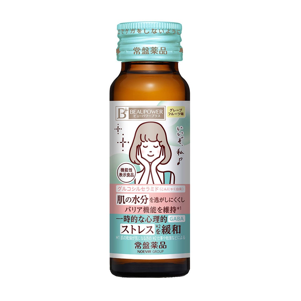 「ビューパワープラス セラミド・GABA<ドリンク>」は、肌の乾燥が気になる方の肌の水分を逃がしにくくし、肌を乾燥から守る機能(バリア機能)を維持することが報告されている「こんにゃく由来グルコシルセラミド」と、睡眠の質(眠りの深さ)の向上に役立つ機能、仕事や勉強などによる一時的な心理的ストレスや疲労感を緩和することが報告されている「GABA」を配合。機能性関与成分として、それぞれ、こんにゃく由来グルコシルセラミド600㎍(マイクログラム)とGABA100mgのW成分を配合しています。低カロリー(2.5kcal)、ノンカフェイン。味にもこだわり、冷涼感を加えたグレープフルーツ味(果汁4%)にカモミールエキスを配合し、ほのかに香る爽やかな味わいに仕上げています。