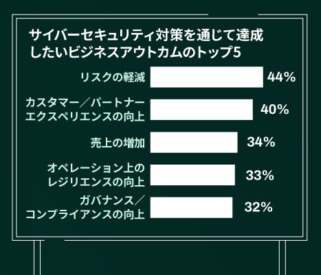 回答者がセキュリティに求めるアウトカムとして最も多かったのはリスク管理で、対象者の44%がセキュリティにおける最優先目標を達成するためのリスク軽減を望んでいる、と回答しています。また、40%の回答者がカスタマーエクスペリエンス (顧客体験) を向上させるためのセキュリティを望んでおり、続いて34%の回答者が売上の増加を挙げています。