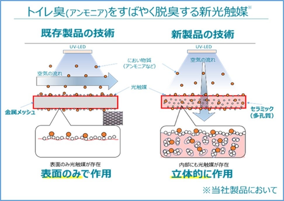 これまでサンスターで採用していた金属メッシュに変わり、独自の改良を行った多孔質のセラミックに光触媒を浸漬させたことで、表面だけでなくセラミック内部にまで光触媒を付着させ、光触媒の含有量を増やすことを実現。それにより、ペットのトイレ臭(アンモニア)などを素早く脱臭する高い脱臭効果、除菌・ウイルス抑制性能※2を発揮します。