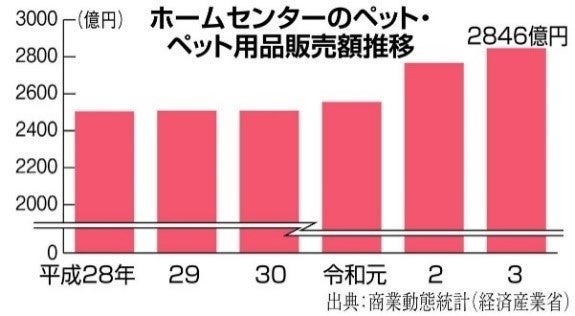 経済産業省の「商業動態統計」によると、ペット用品の多くを扱うホームセンターでのペットと同用品の販売額はコロナ禍になった令和2年以降大きく伸びました。3年は2,846億円とコロナ禍前の令和元年と比べ11%増えています。