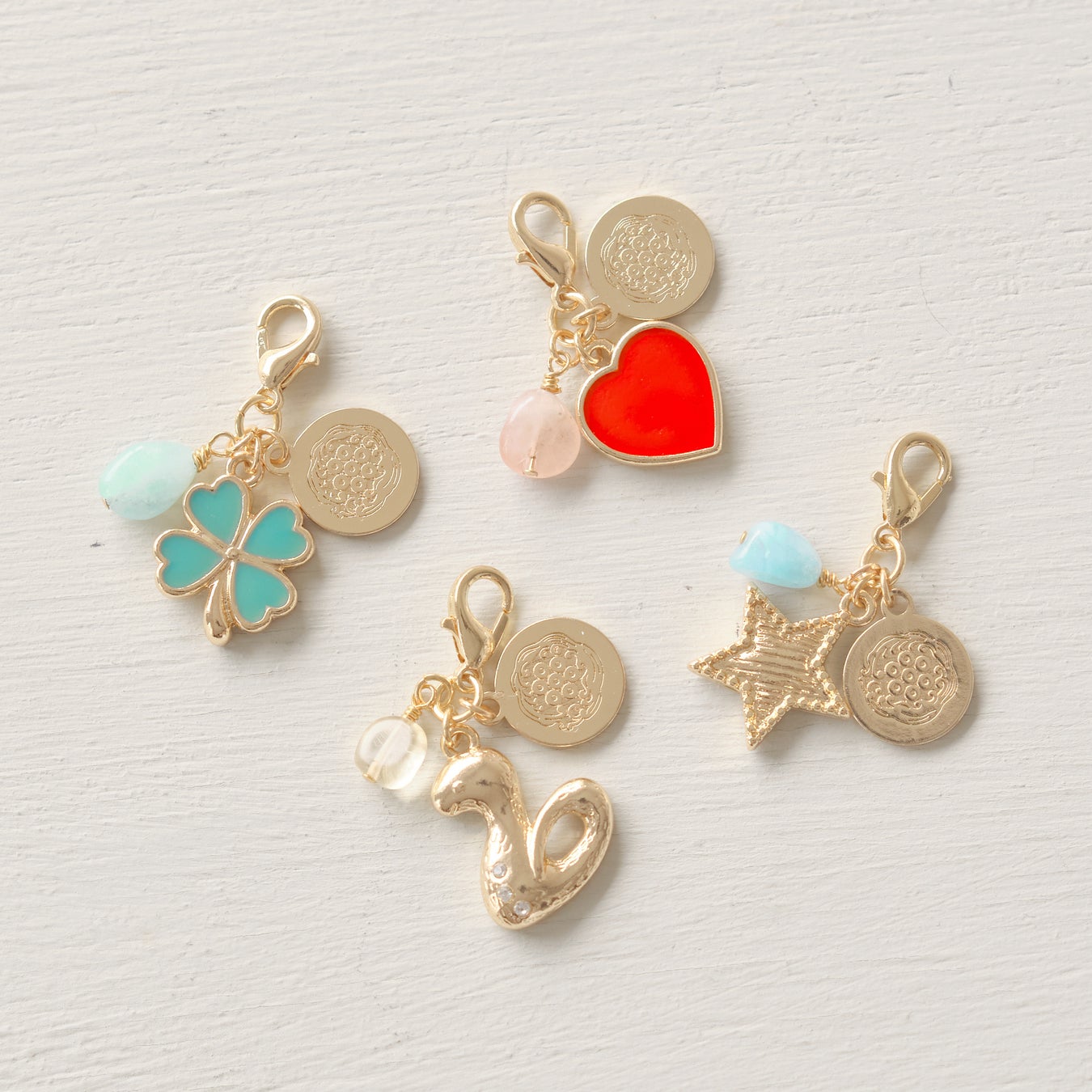 天然石とそれぞれの象徴的なモチーフをあしらった4種のチャーム。