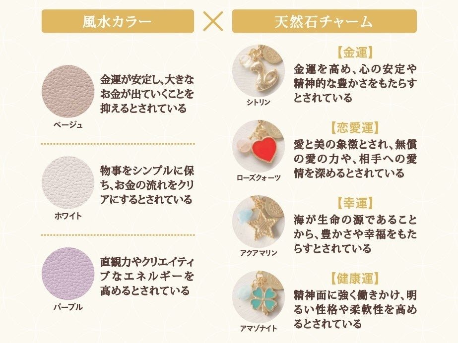 風水に基づいたカラーのお財布と、天然石のチャームで運気をコーディネイトしてみてはいかがでしょうか。
