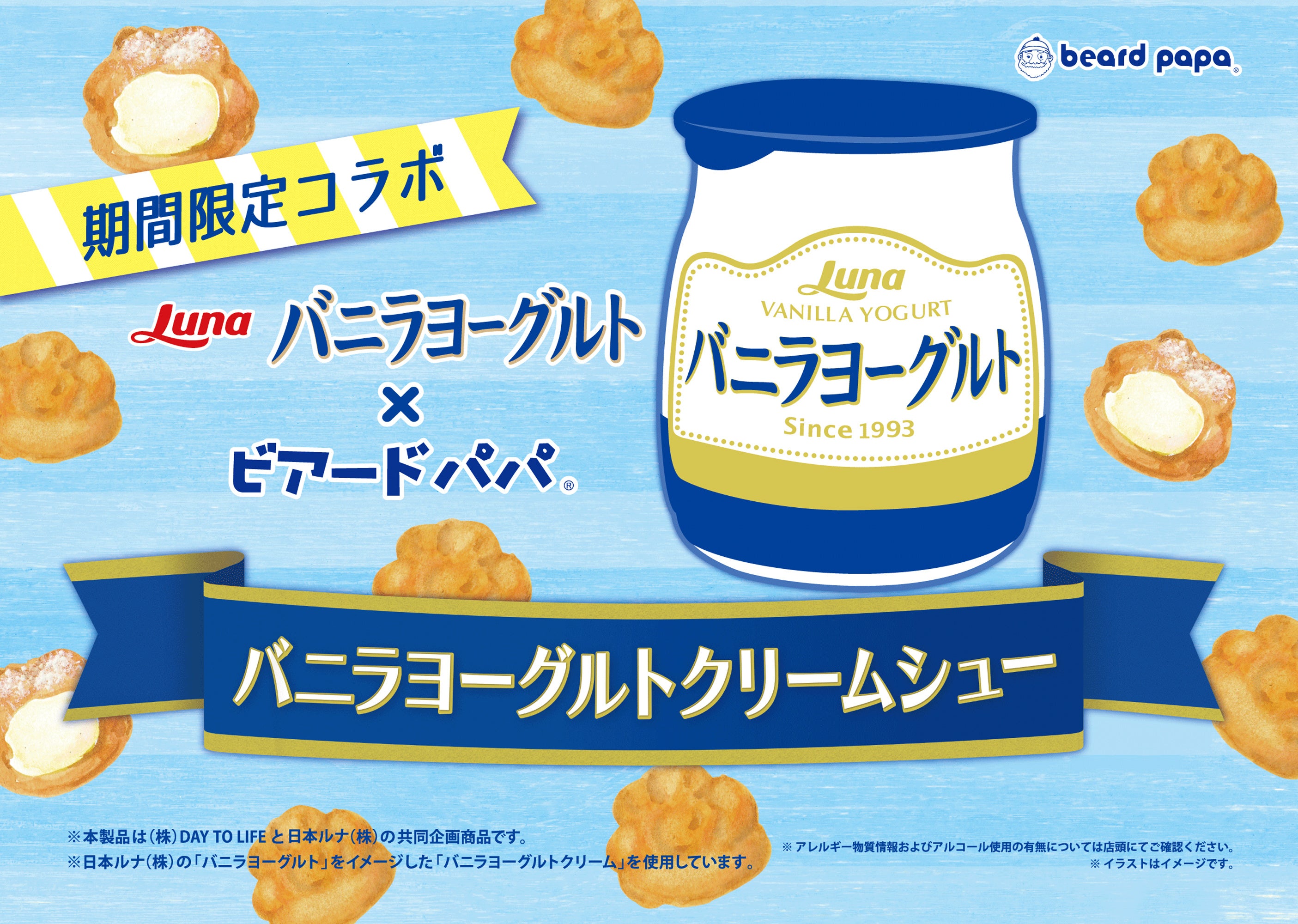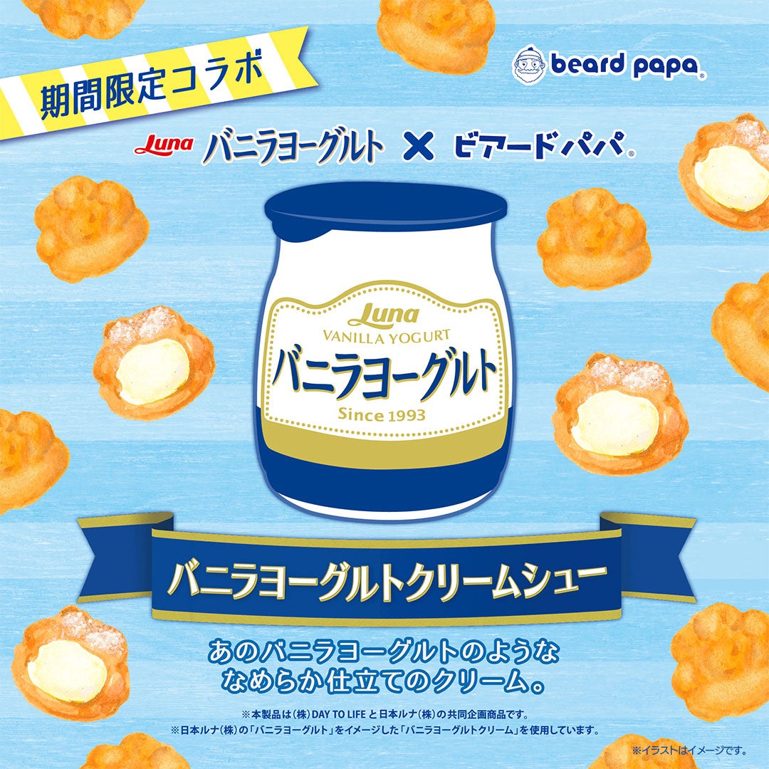 株式会社DAY TO LIFE(本社:大阪府大阪市北区、代表取締役社長:杉内健吉)が展開するシュークリーム専門店ビアードパパは、2025年7月1日(火)より、日本ルナ株式会社(本社:東京都品川区、代表取締役社長:萩野稔之)のロングセラー商品“バニラヨーグルト”をイメージしたコラボレーション商品“バニラヨーグルトクリームシュー”を7月限定で販売いたします。