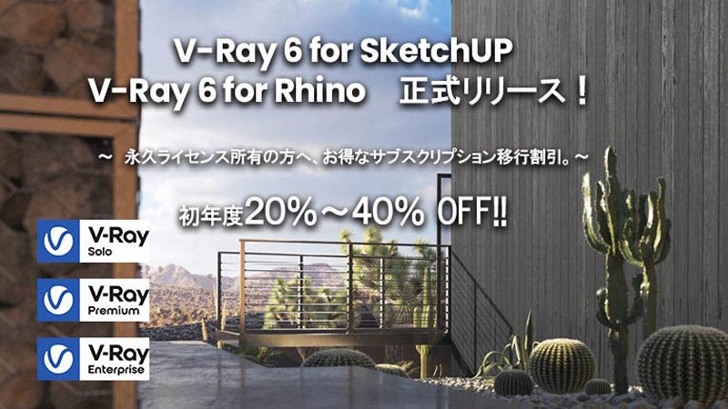 なお、これまでにV-Ray 3、V-Ray Next、V-Ray 5の永久ライセンスをご購入されていたお客様が、新たに用意された1年間のサブスクリプションライセンスへ移行される場合、初年度については、通常より20~40%お得な特別価格でのご購入が可能となっています。このライセンスの中で、今回リリースされたV-Ray 6 for SketchUpおよびV-Ray 6 for Rhinoをご利用いただけるようになります。また、その他のリリース済ならびに今後リリースされるV-Ray 6製品をご利用いただくことができます。