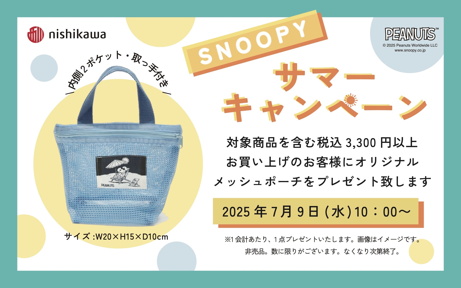 期間中、開催店舗にてnishikawaのPEANUTSデザイン商品を3,300円(税込)以上ご購入い ただいたお客様に、スヌーピーデザインの「オリジナル メッシュポーチ」(非売品)をプレゼントします。