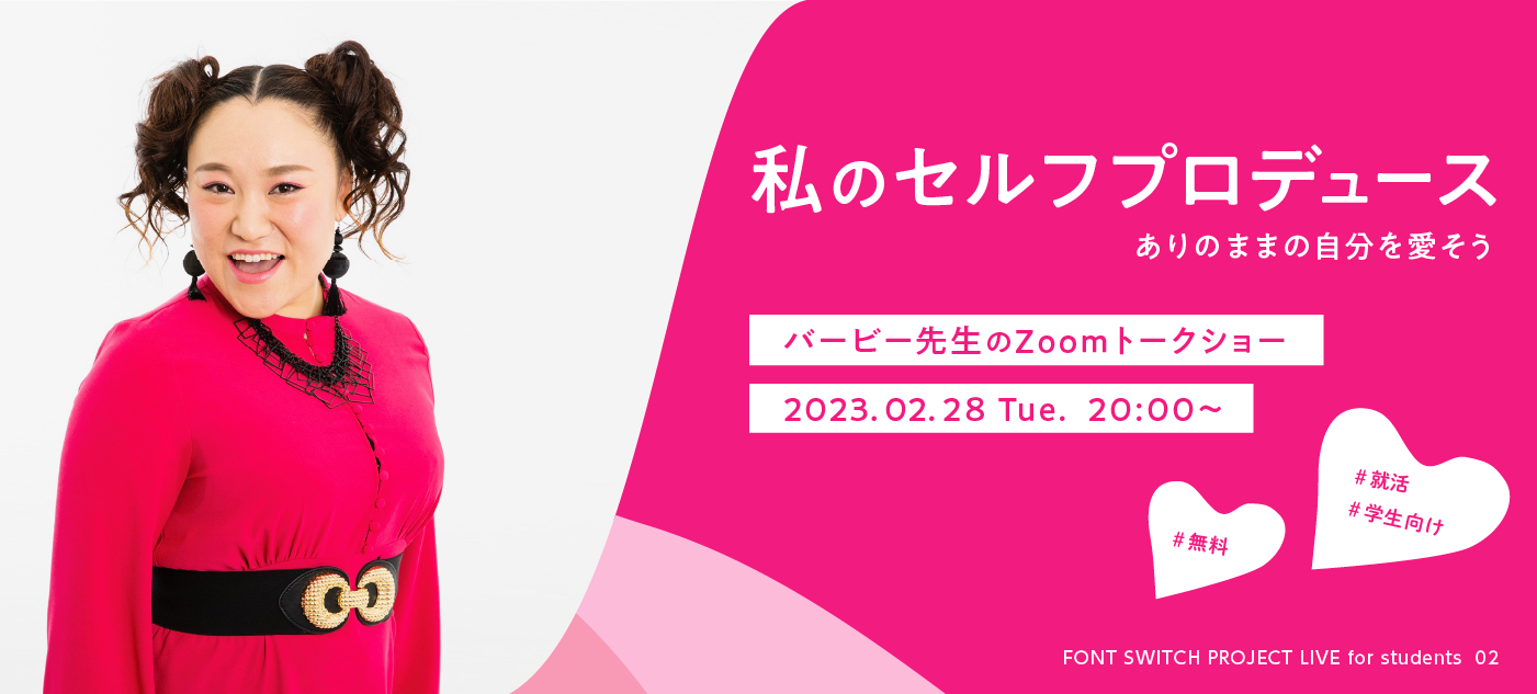 株式会社モリサワは、フォントの情報発信をする「FONT SWITCH PROJECT」の企画において、学生の方を対象としたZoomトークショー「私のセルフプロデュース ありのままの自分を愛そう」を2023年2月28日(火)に開催します。