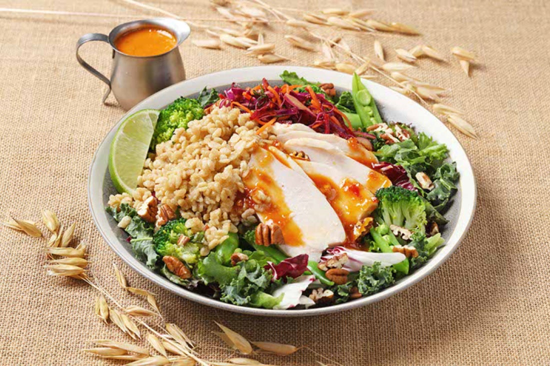 スチームチキンに香ばしくコクのあるピーカンナッツを添えた彩り豊かなサラダボウルです。スイートチリとピーナッツを使用した甘辛のガドガドドレッシングをかけてお召し上がりください。
