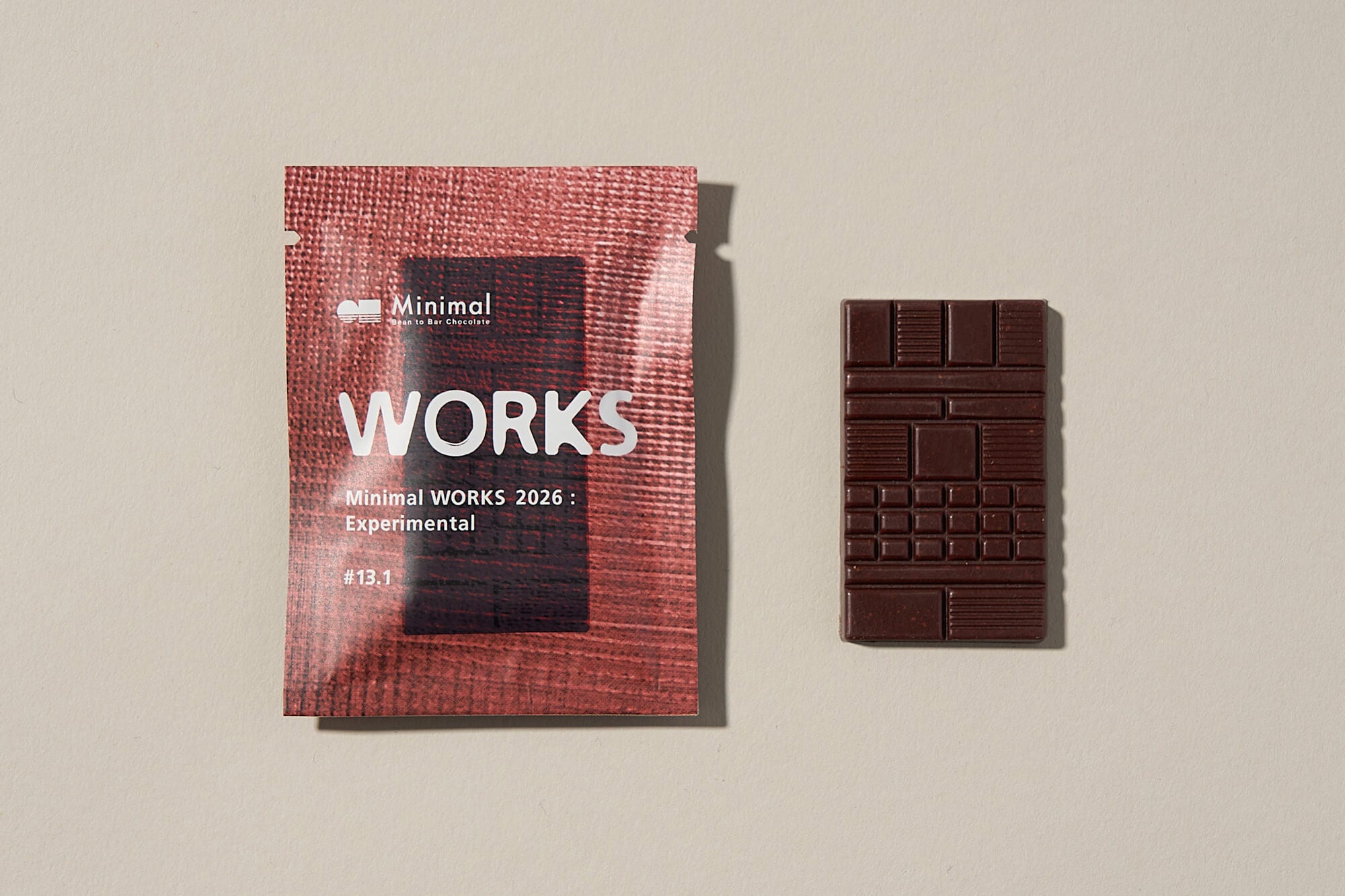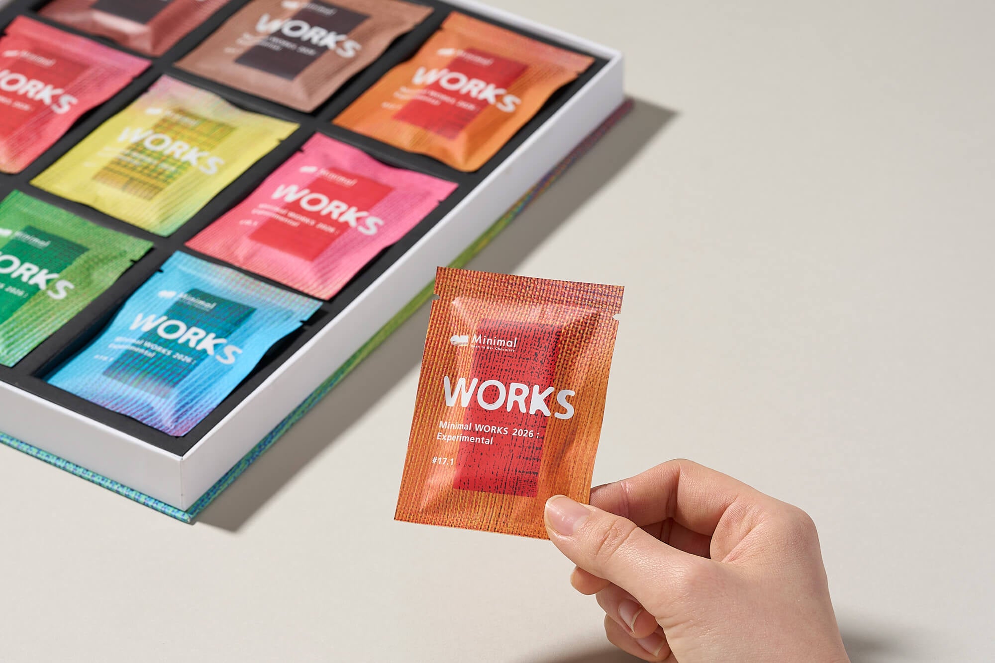 「Minimal WORKS」シリーズは、1年に一度、その年のテーマを掲げておつくりする、“職人たちの作品集(Works)”をコンセプトとした、9種の板チョコレートのアソートセットです。今年のテーマは「Experimental」。
