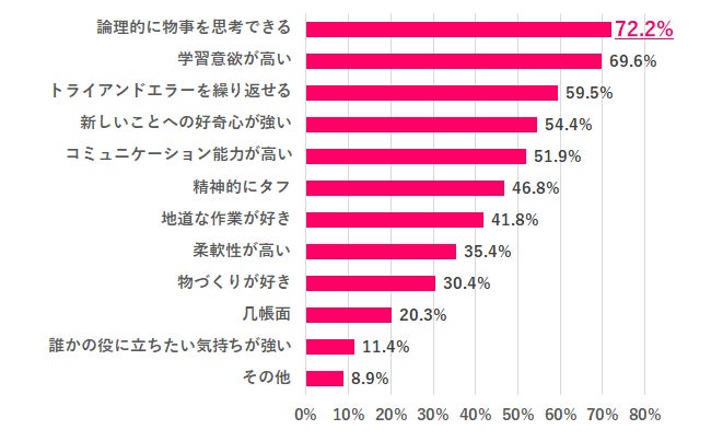 ITエンジニアに向いている人について尋ねると、1位「論理的に物事を思考できる」72.2%、2位「学習意欲が高い」69.6%、3位「トライアンドエラーを繰り返せる」59.5%となりました。「新しいことへの好奇心が強い」「コミュニケーション能力が高い」も半数以上の人が回答しています。