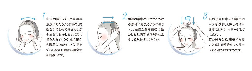 1.中央の集中パーツが頭の頂点にあたるようにあて、両端を手のひらで押さえながら左右に動かします。(穴に指を入れてもOK) 生え際から襟足に向かってバンドをずらしながら動かし頭全体を刺激します。