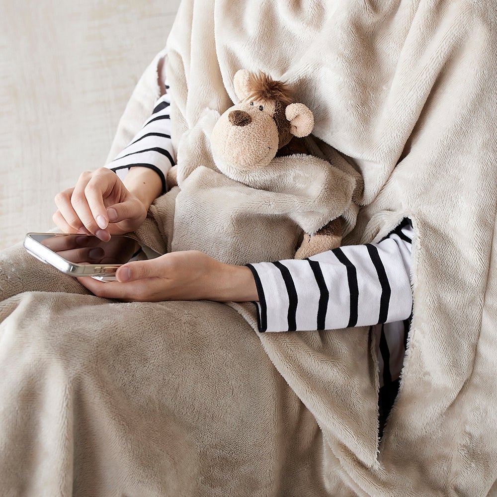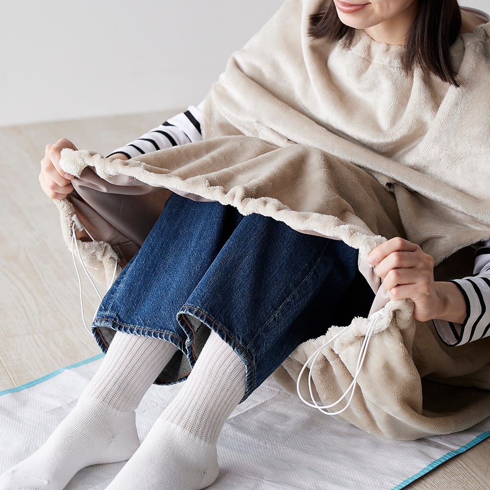 また、首元と裾部分には両サイドにアジャスターがついており、首元や裾を絞ることですきま風を防ぎます。また、アームホールが付いているので、毛布を着たままでもスマホやタブレットを触りやすい仕様です。