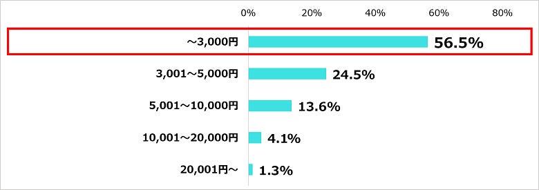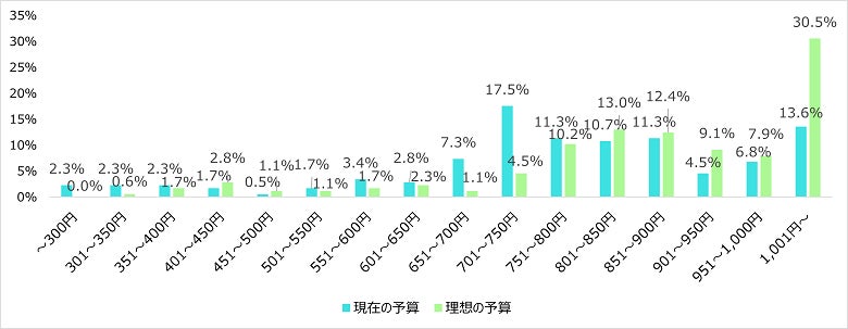 現在の予算は701円~750円が最多、理想の予算は1,001円以上が最多となった。