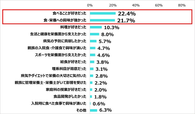 さらに、管理栄養士・栄養士を目指したきっかけについても調査したところ、上位は食べることが好きだった、食・栄養への興味が強かったという、自身の体験や興味がモチベーションを支えていることが伺える結果となりました。