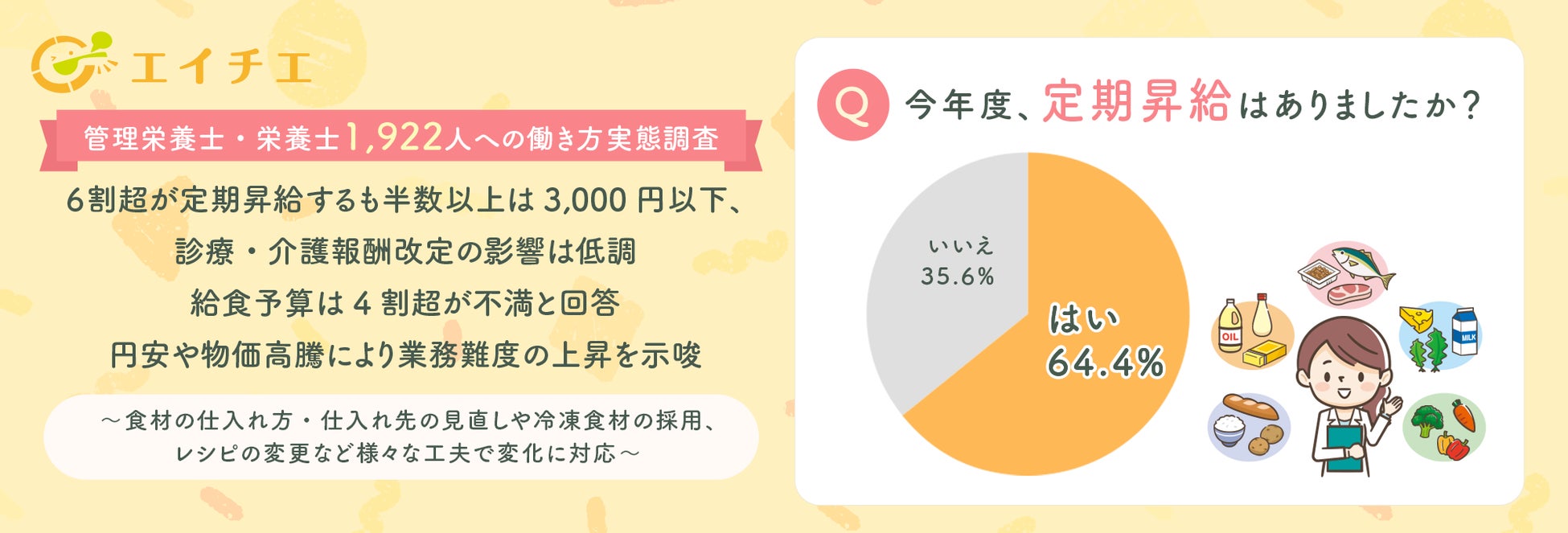 【管理栄養士・栄養士1,922人への働き方調査】6割超が定期昇給するも半数以上は3,000円以下、診療・介護報酬改定の影響は低調。給食予算は4割超が不満と回答。円安や物価高騰により業務難度の上昇を示唆