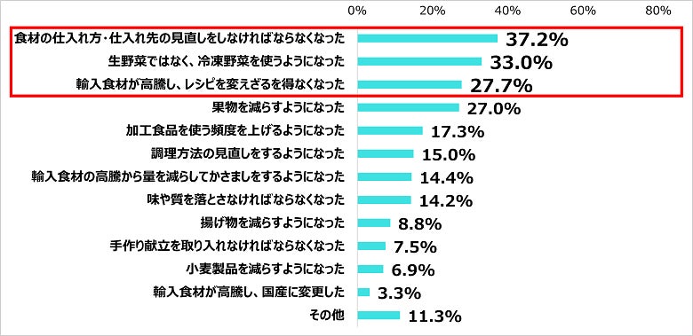 次点で「生野菜ではなく、冷凍野菜を使うようになった(33.0%)」、「輸入食材が高騰し、レシピを変えざるを得なくなった(27.7%)」が上位となった。