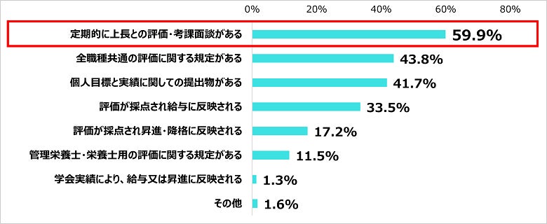 考課制度があると回答した人の中で、内容については定期的に上長との面談ありと回答した人が59.9%だった。