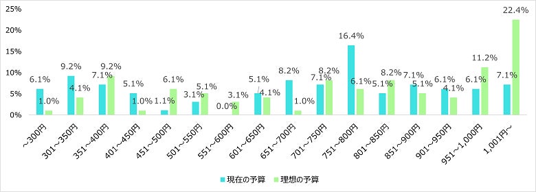現在の予算は751円~800円が最多、理想の予算は1,001円以上が最多となった。