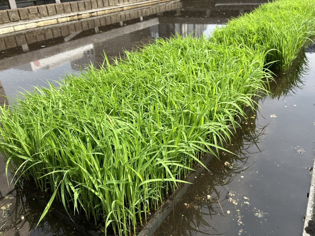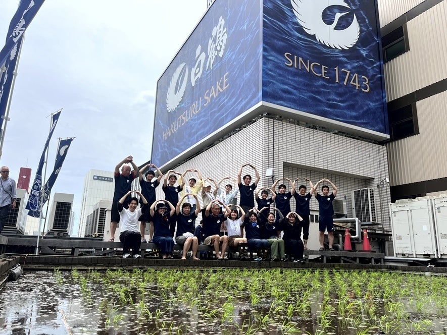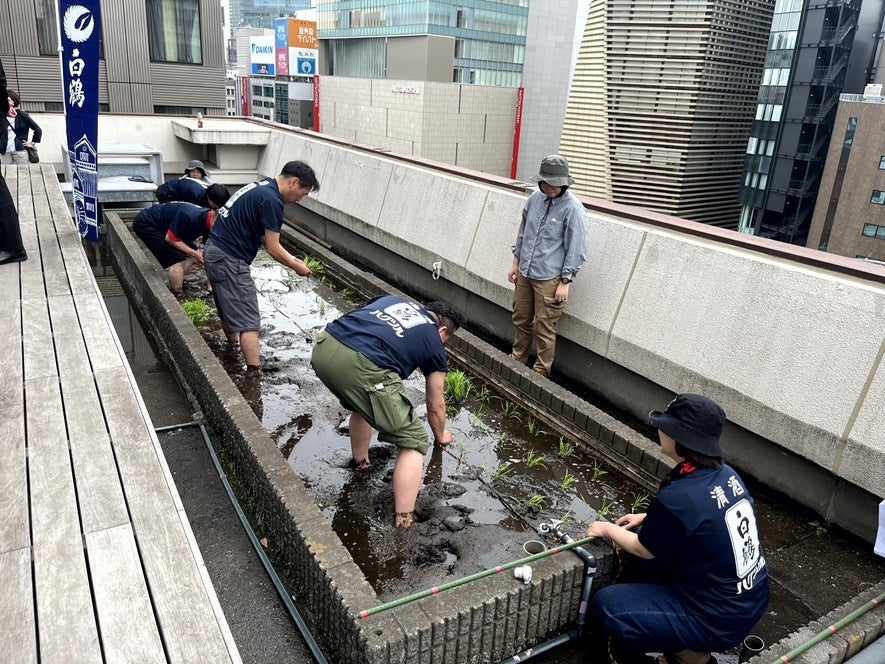 東京・銀座屋上の田んぼ「白鶴銀座天空農園」で自社開発酒米「白鶴錦」の田植えが無事終了!~日本酒文化の発信と屋上緑化、食育の取り組み~