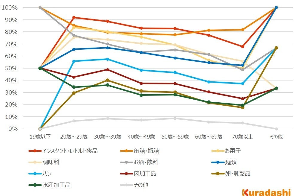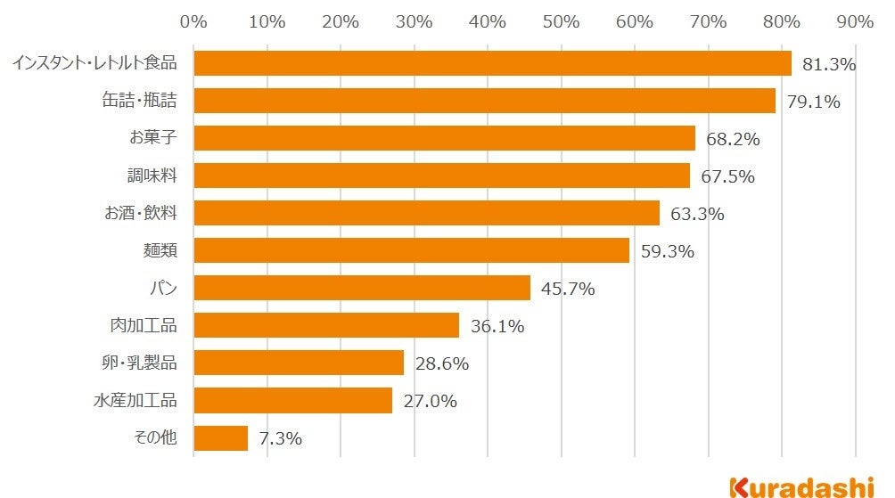 | 【意識調査サマリ】 ・フードロス削減に継続的に取り組んでいる人は昨年対比+0.8ptで79.5% ・フードロス削減のために取り組みとして「『Kuradashi』などを利用して賞味期限の近い食品を購入する」と回答した人は昨年対比+6.8ptで68.4% ・これまでにフードロスを発生させたことがある人は89.8% ・これまでに廃棄してしまった食品は「野菜・果物」が最も多く68.9% ・賞味期限が過ぎていても気にせずに消費する食品として最も多かったものは「インスタント・レトルト食品」で81.3% |