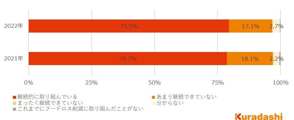 「継続的に取り組んでいる」と回答した方は昨年対比0.8pt上昇し、79.5%でした。回答者全体の98.7%が、フードロスが問題になっていることを知っているにも関わらず(調査結果1を参照)、「継続できていない」「分からない」等の回答をした方が約20%いることから、フードロス削減の機会損失が発生していると言えます。