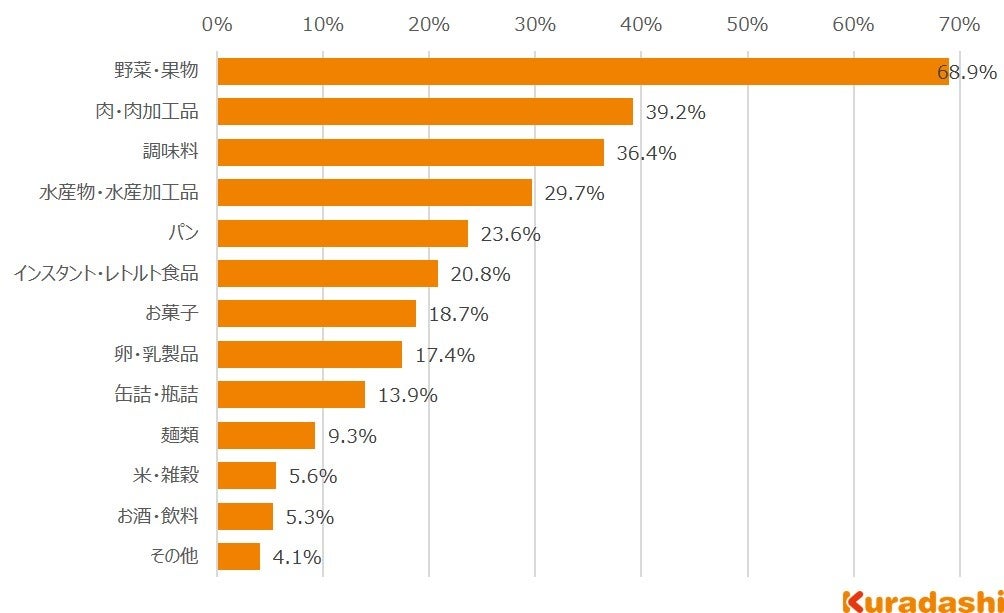 これまでに廃棄してしまった食品は「野菜・果物」が最も多く68.9%で、回答者全体の3人に2人がこれまでに廃棄した経験があるという結果でした。次いで多かった回答は「肉・肉加工品」で39.2%、「調味料」で36.4%でした。