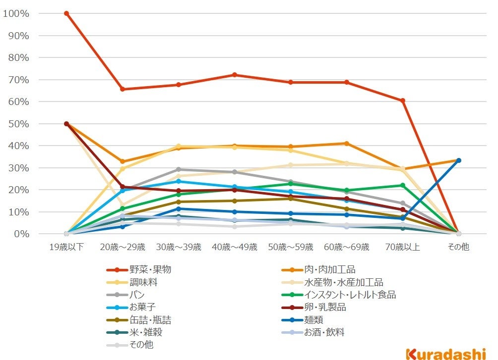 これまで廃棄してしまった食品に関する傾向として、「パン」、「お菓子」を廃棄してしまった人は年代が上がるにつれて減少しています。一方、「水産物・水産加工品」、「インスタント・レトルト食品」を破棄してしまった人は年代が上がるにつれて増加しています。