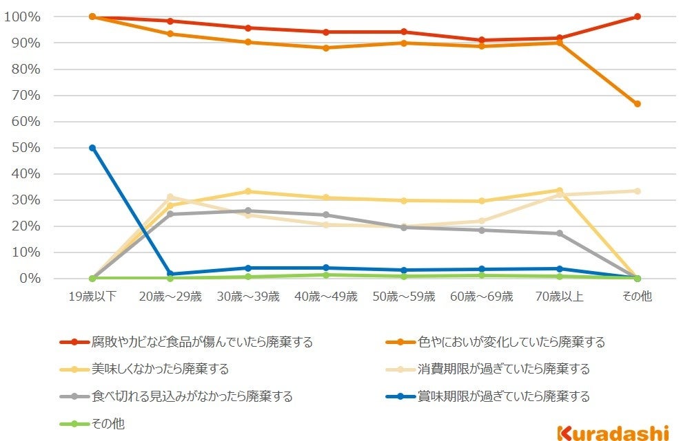 20歳~29歳のみ、「消費期限が過ぎていたら廃棄する」がその年代の回答で3番目に多い結果となっています。また、「食べ切れる見込みがなかったら廃棄する」という回答は、49歳以下の年代では20%以上である一方、50歳以上の年代では20%を下回っており、世代間によって判断に差が表れています。