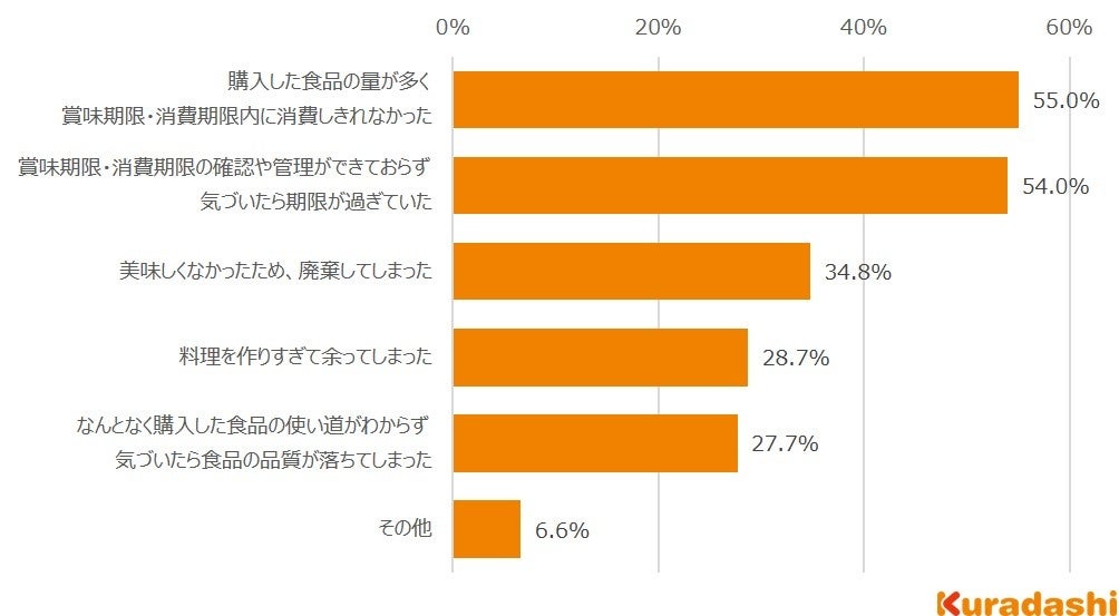 フードロスを発生させた理由で最も多かった回答は「購入した食品の量が多く、賞味期限・消費期限内に消費しきれなかった」で55.0%、次いで「賞味期限・消費期限の確認や管理ができておらず、気づいたら期限が過ぎていた」で54.0%でした。